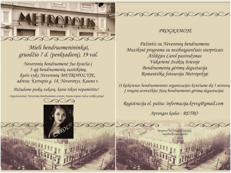 ,,Mes pažadame ypatingą bendrystės vakarą žvakių šviesoje, išskirtinę muzikinę programą su atlikėja Carol priešakyje, romantišką fotosesiją, daug juoko, siurprizų ir nuotraukų, kurias norėsite įsirėminti. Mūsų bendruomenė tiek sukaupusi šilumos ir pozityvios energijos, kad norime pasidalinti su visais atvykstančiais. Laukiame Jūsų ištiesę raudoną kilimą – jis ypatingiems svečiams“, – kvietime pažymi Neveronių bendruomenės centro pirmininkė, būsimo susitikimo šeimininkė Oksana Šukaitienė.